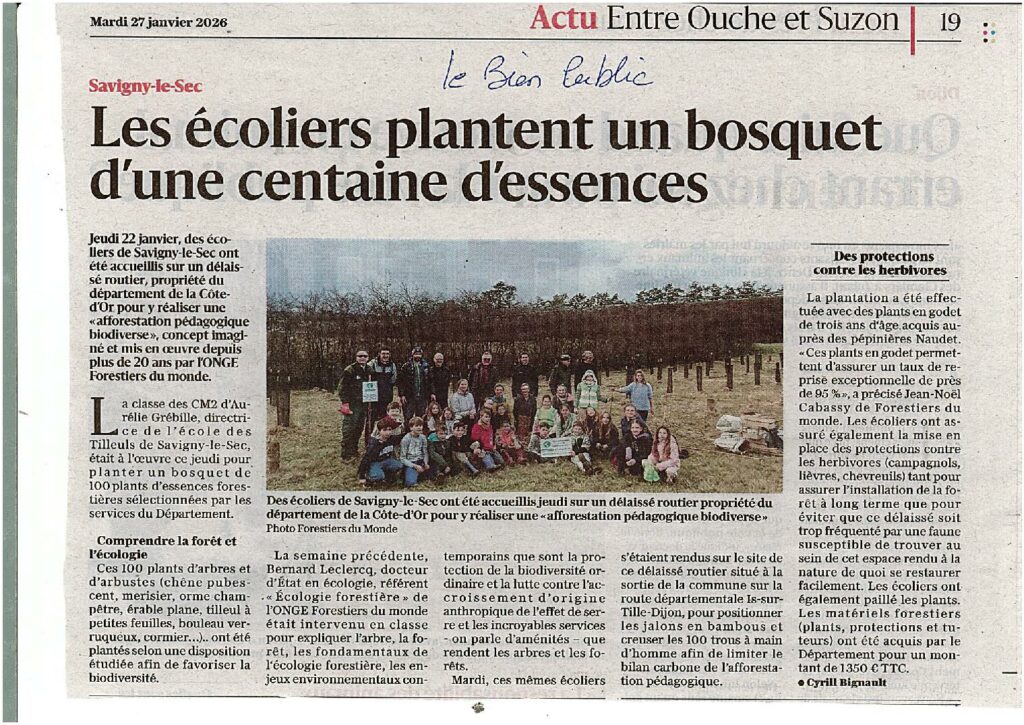 Pour la première fois en Côte d’Or, ce jeudi 22 janvier 2026, des écoliers ont été accueillis sur un délaissé routier propriété du département de la Côte d’Or pour y réaliser une afforestation pédagogique biodiverse, concept imaginé et mis en œuvre depuis plus de 20 ans par l’ONGE Forestiers du Monde®.